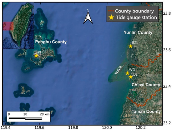 The WSDB is located in a shallow water area and does not have a tide gauge station. To correctly calculate the local tidal level at image acquisition, we required tidal level data from nearby tide gauge stations. Four tide stations near the WSDB provided reference tidal level data for the WSDB. The four stations are Boziliao (BZL), Dongshi (DS), Wengang (WG), and Penghu (PH), which are in Yunlin County, Chiayi County, and Penghu County, respectively.