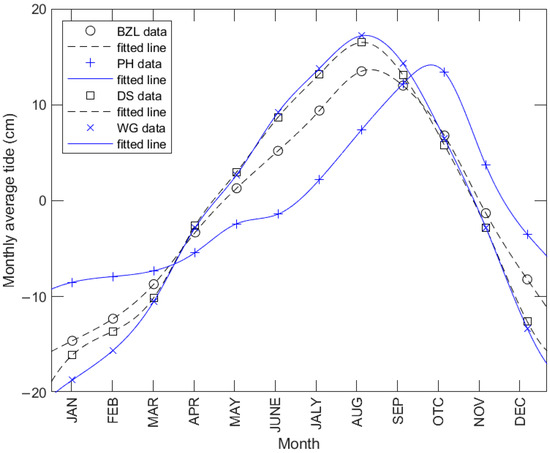 The monthly average tidal levels at the BZL, DS, and WG stations were high in summer and low in winter, with the maximum value achieved in August. Since DS and WG are located close to each other, the changes in monthly average tidal levels were similar. BZL had a slightly lower maximum monthly average tidal level than both DS and WG. PH had a maximum monthly average tidal level in October and a minimum level in January. The variation in the monthly average tidal level at PH was different from that at the other three stations. The difference between the maximum and minimum values of PH was also lower than that of the other three stations. This may have been due to PH being located in the Taiwan Strait, with relatively deep and wide waters, while the other three stations are located in shallow waters. The latter three are greatly affected by water temperature.