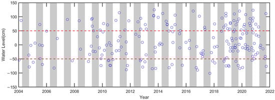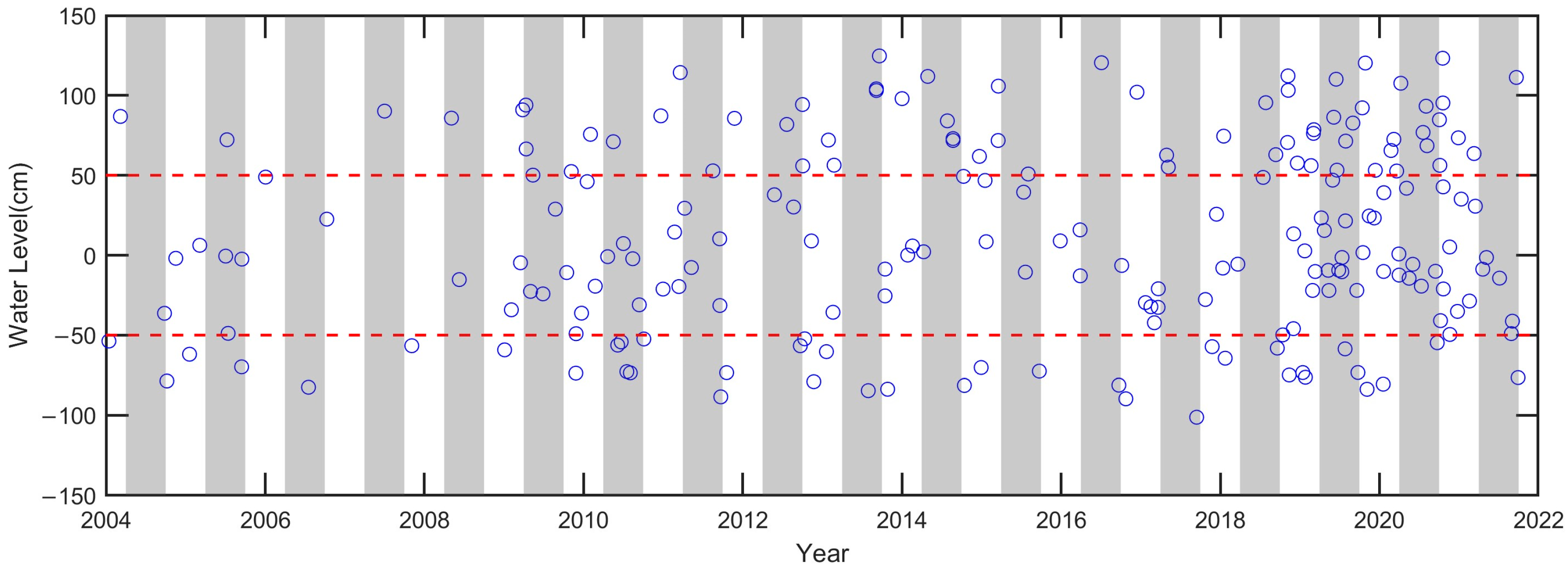 The distribution of the 207 satellite images by acquisition date and corresponding tidal level. Blue open circles represent individual images. Red dashed lines indicate the ± 50 cm range around the Mean Tidal Level. Gray-shaded areas correspond to the summer season (April to September).