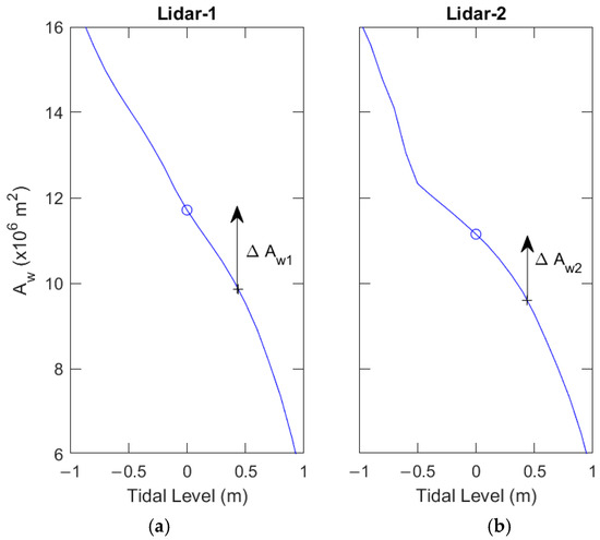 If a satellite image was taken between two adjacent LiDAR measurements, an example of the interpolated land area of the satellite image from these two LiDAR measurements is marked with a red asterisk at the blue curves in Figure 4a. We used the cubic spline interpolants to estimate the land area at the tidal level where the image was taken to be 0.439 m for the LiDAR-1 case, as shown in the left panel of Figure 4. The land area enclosed by the zero-meter tidal level is marked with a black circle, indicating the land area enclosed by the zero-meter shoreline at the time of such LiDAR measurement. The vertical line in the left panel of Figure 4, denoted by ΔAw1, shows the area difference at such a tidal level and at the zero-meter level. Following the above procedure, we found the area difference, denoted by ΔAw2, for another LiDAR measurement, as shown in the right panel of Figure 4.
