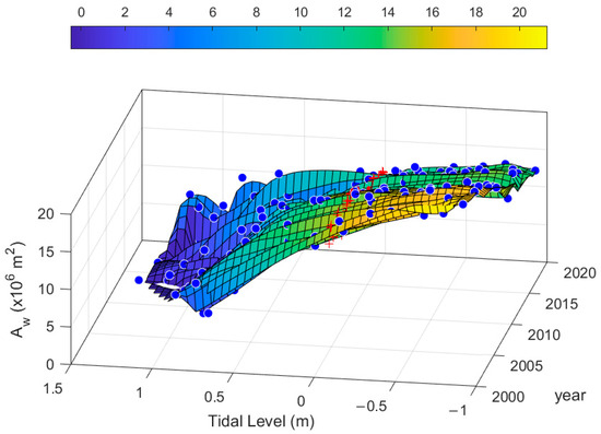 Figure 5 shows the fitted surface in the color bar and all images in blue circles with respect to two variables: tidal levels and years. The Aw reduction due to high tidal level and year-by-year changes is shown visually in Figure 5. By applying the zero-meter tidal level to the fitted surface, we can interpolate As from the time series. The red crosses in Figure 5 display the results of the SFM.