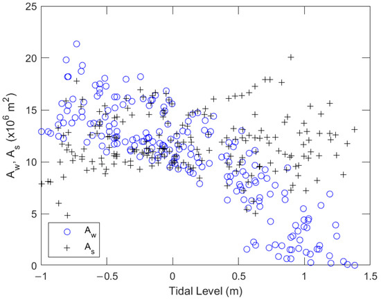 The waterline extracted from a satellite image is an instantaneous position at the moment when the sea water and the land intersect. The waterline’s position varies with the tidal level and changing beach. The blue open circles of Figure 6 show the Aw and As of the WSDB against corresponding tidal levels, which vary from about –0.91 m to 1.47 m. As the tidal level rises, the sea water submerges more land on the WSDB, leaving less land exposed. This leads to a reduction in the area enclosed by the waterline. The blue circles in Figure 6 show that the Aw of the WSDB has a quadratic and band-like attenuation as the tidal level increases. The value of CC between Aw and tidal levels is –0.8526, indicating a negatively strong relationship.