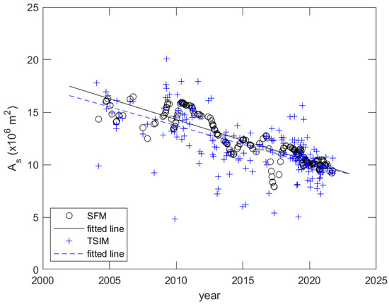 Regardless of the tidal level, both the TSIM and SFM can be used to determine As over time. Figure 7 displays the results for all images, with the open circles representing the areas obtained via the SFM and the crosses representing the TSIM. The two straight lines in Figure 7 are the fitted lines generated using linear regression for the two sets of As.