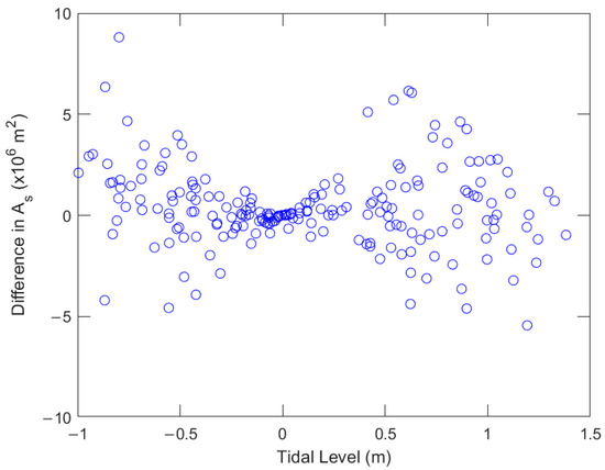 To investigate the short-term rapid change in the estimated As using the TSIM, in Figure 7, we show the difference in As estimated via the TSIM and SFM against the tidal level. Figure 8 shows that the area difference at a tidal level deviation higher than 0.25 m has a significantly large distribution. When the tidal level is in the range of 0.25 m, the estimated As is close. There are 63 such cases.