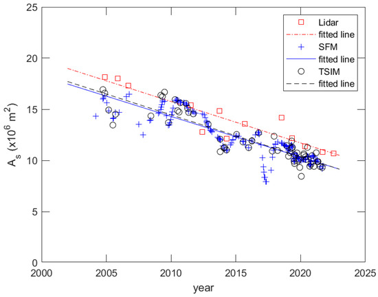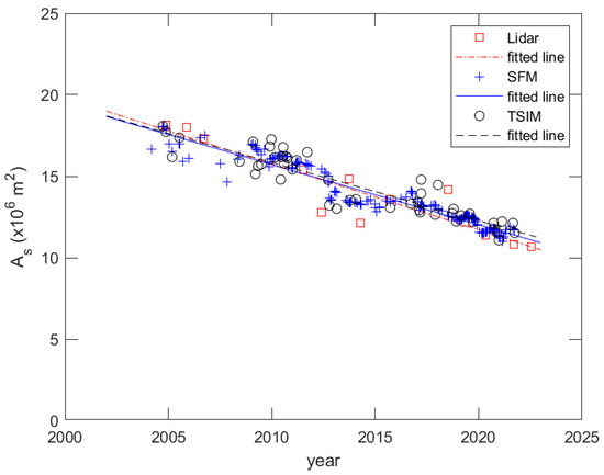 The slopes of these fitted lines, indicating the rate of area reduction, are very close, and they are –0.4049, –0.3969, and –0.4083 × 106 m2/year, respectively. The R2 of the prediction made using LiDAR data is 0.8551. For the SFM and TSIM, R2 is 0.7795 and 0.8072, respectively. All three R2 values are high. The RMSEs between the As obtained and the predictions determined using LiDAR data and images using the SFM and TSIM are 0.9622, 1.0076, and 1.0043 × 106 m2, respectively. According to these evaluation indicators, all three As values are close to the predicted values of time linear regression.