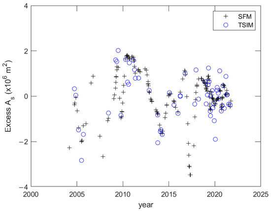 The interannual changes in the excess area of the WSDB estimated via the SFM (cross) and TSIM (open circle). The excess areas obtained via the two methods have similar interannual changes.
