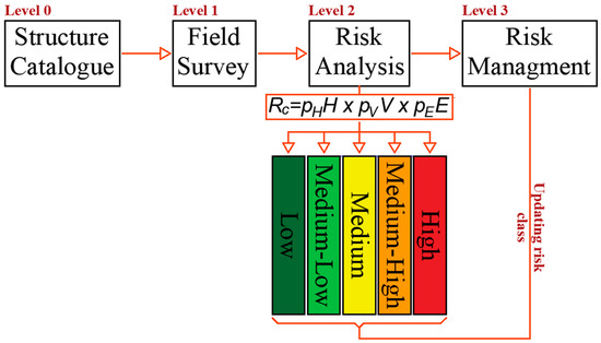 In Level 2, the actual risk analysis of a given construction (building or infrastructure system) is performed based on the combination of Hazard (H), Vulnerability (V), and Exposure (E) classes considered as independent criteria. In the analysis framework, each class is defined qualitatively through a five-level scale, defined by primary parameters (capable of addressing a preliminary class evaluation) and secondary parameters (able to adapt the preliminary classification). The outcome of the analysis is a five-tier risk classification (high, medium-high, medium, medium-low, low), obtained by a weighted combination of H, V, and E (Equation (3)).