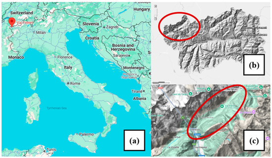 Geographic reference of the study area in Italy (a), in Aosta Valley (b), and in the municipality of Courmayeur (c). Modified (a,c) from https://www.google.it/maps accessed on 30 March 2025, (b) from https://mappe.regione.vda.it/pub/geoCartoSCT/ accessed on 30 March 2025.