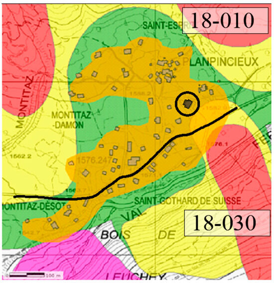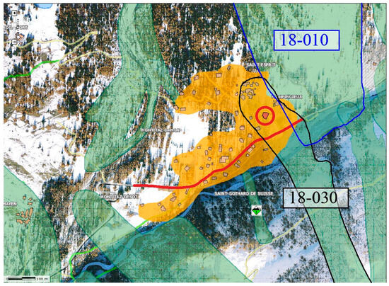 The CRV, in Val Ferret, identifies 85 different avalanche paths, some of them flowing in uninhabited areas, others interacting with the local road or the settlements. Specifically, the study area (Figure 5) is affected by two avalanche paths: (1) the Planpincieux-Margueraz avalanche (identified by the code 18-010 in CRV), and (2) the Mont de la Saxe-Planpincieux A avalanche (coded 18-030 in CRV). The first one detaches from Mont Blanc massif (around 4200 m a.s.l.), laps the urbanised area, and intersects the local road; while the second one, the 18-030, has its starting zone in the proximity of the Mont the la Saxe ridge (around 2302 m a.s.l.) flowing and intercepting the road and the urbanised area (1579 m a.s.l.).