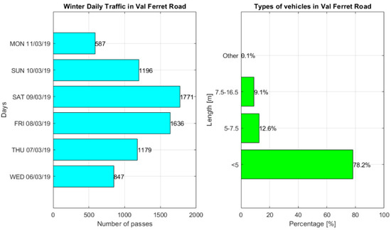 As stated in [32], the traffic trend is steady, so this campaign can represent the past and future data about the traffic on the Val Ferret Road. The winter daily traffic exhibits a high fluctuation, highlighting the classic trend of tourist routes, depending on the day of the week and the daily weather conditions (Figure 6). During the avalanche hazard season (November–April), traffic oscillates depending on the period, weather conditions, and holidays. Unfortunately, these trends have not been caught by the monitoring campaign. The cars mainly compose the traffic, but the other categories (vans and buses) cannot be neglected in the analysis, as stated in other similar work [21].