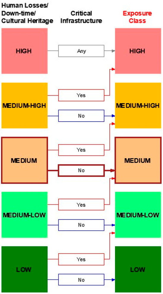 Finally, as suggested by the method, when dealing with densely populated buildings, the primary parameter of exposure should be set to high. With regards to the secondary parameter, the hotel is not a strategic building. Combining the primary parameter with the secondary one, as shown by the flowchart in Figure 10, returns a high E.