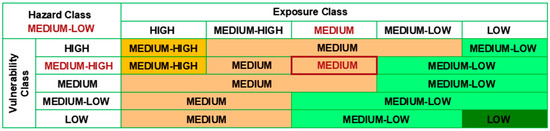 where represents the Risk Class; , , and are, respectively, Hazard Class, Vulnerability Class, and Exposure Class, in a scale from one (low class) to five (high class); and stand for weight parameters of hazard, vulnerability and exposure, respectively. The classes are dimensionless since they represent categorical results.