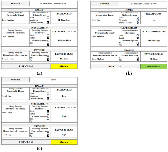 Figure 12 summarises the main steps described previously. In particular, for the cases studied (Val Ferret Road under the effect of the avalanche path 18-030 and 18-010, and the hotel), the primary and secondary parameters, and the consequent classes are depicted for each category (hazard, vulnerability, and exposure). At the end, the RCs are shown.