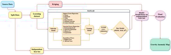 The flowchart illustrates the application of machine learning methods for predicting gravity anomalies. The first stage involved data preparation, wherein the initial dataset was divided into the two following subsets: