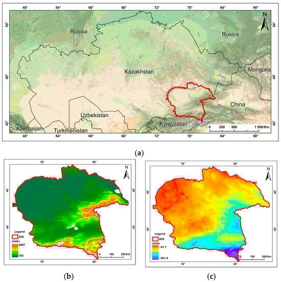 The study area is located in southeastern Kazakhstan, within the coordinates 42°25′–47°20′ N and 73°43′–82°10′ E (Figure 2a). This region encompasses a diverse range of topographic and geological features, including the mountainous terrain of the Tian Shan and Zhetysu Alatau ranges, as well as extensive lowland deserts, providing an ideal setting for gravity field analysis.
