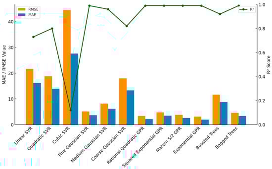 Based on the evaluation of performance metrics (Figure 3), the best-performing models were selected within each of the following method categories: Fine Gaussian SVR among Support Vector Regression (SVR) models; Exponential GPR among Gaussian Process Regression (GPR) models; and Bagged Trees among the ensemble methods, which included both Boosted Trees and Bagged Trees.