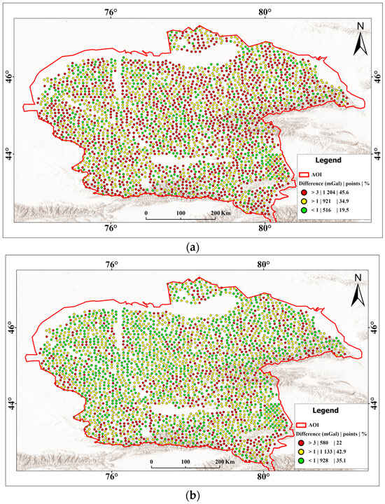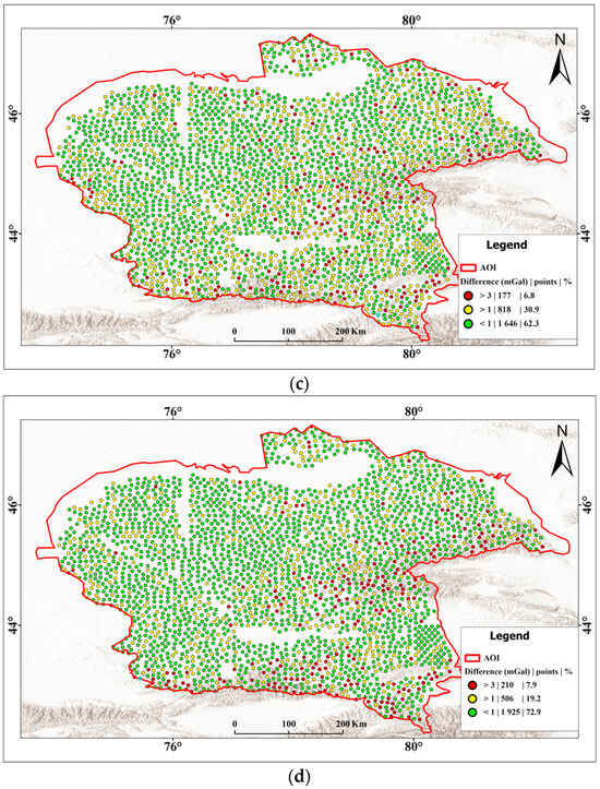 According to Denker [35], a prediction accuracy of approximately 1 mGal is generally considered sufficient to achieve a 1 cm geoid model. This threshold, thus, serves as a scientifically supported baseline for distinguishing small errors that do not critically affect high-precision geoid computation.