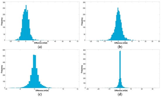 Histogram of prediction error distribution for Bouguer anomaly values using different interpolation methods: (a) Fine Gaussian SVR, (b) Bagged Trees, (c) Kriging, and (d) Exponential GPR.