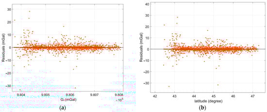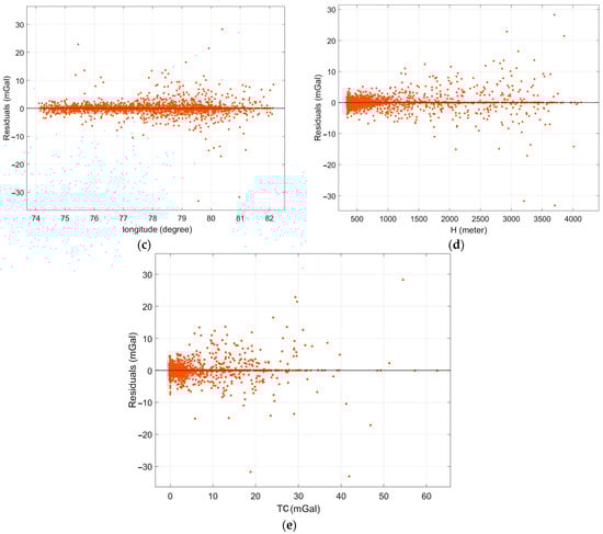 Figure 6 presents the differences between the actual and predicted simple Bouguer anomaly values as functions of normal gravity (G0), latitude, longitude, elevation (H), and terrain correction (TC). An analysis of the presented graphs reveals that the largest discrepancies are observed in mountainous regions. Geographically, the errors correlate with areas of high terrain correction values, greater elevations, and specific latitude and longitude ranges, which correspond to the locations of mountain ranges (Figure 2b).