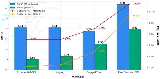 Comparison of RMSE and outlier percentage in mountains and plains using Exponential GPR, Kriging, Bagged Trees, and Fine Gaussian SVR methods.