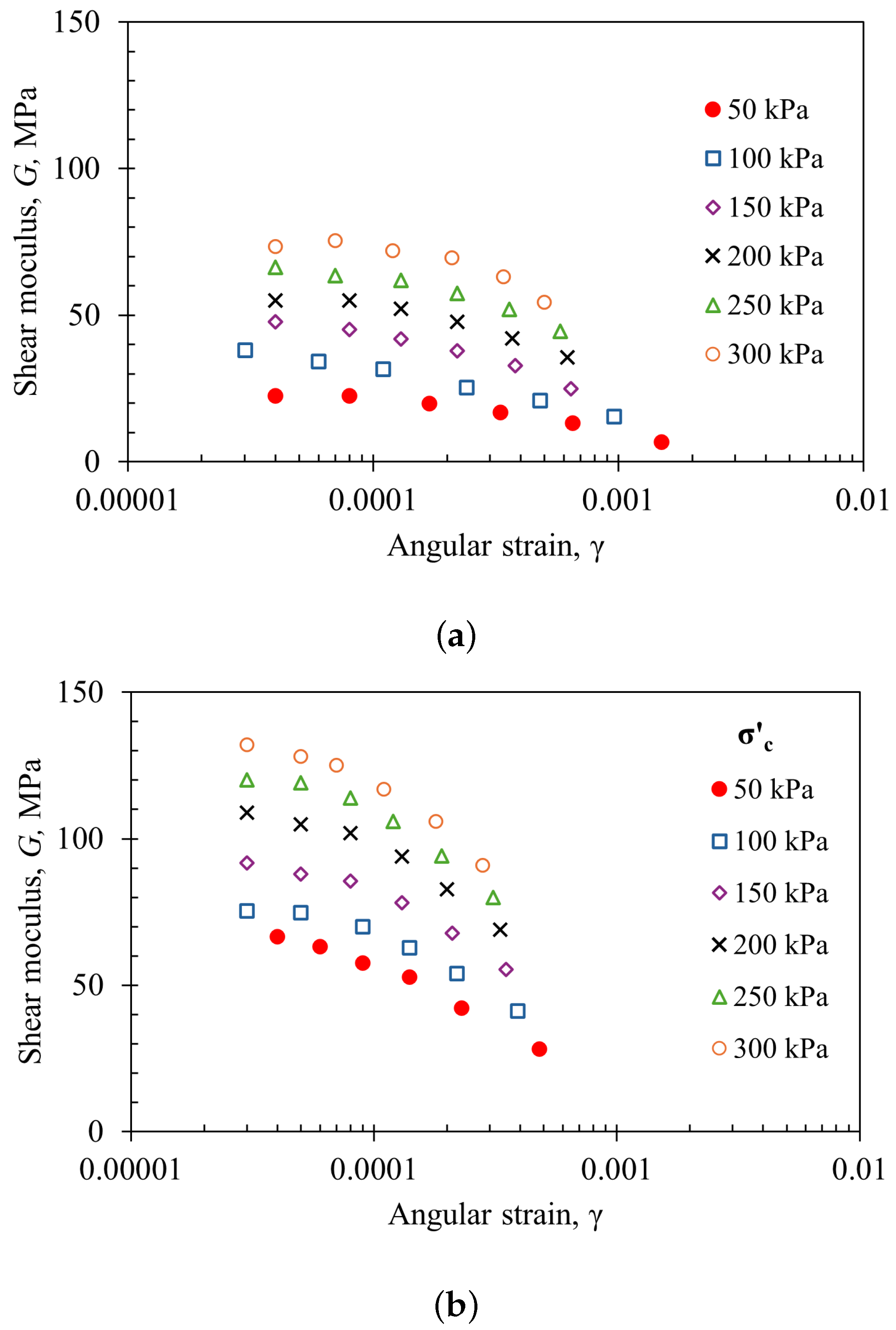 - The dynamic stiffness modulus (G) exhibited a substantial reduction with decreasing confining stress (), reinforcing its dependency on stress conditions. The variation of G as a function of angular strain () for different followed a clear trend, which follows a hyperbolic function. Moreover, the maximum shear modulus () varied with following a power–law relationship, with high correlation coefficients ().