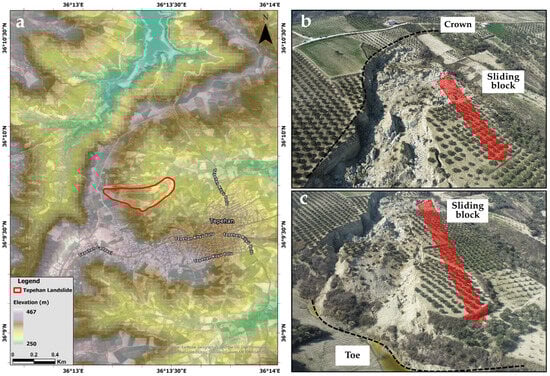 On 6 February 2023, two significant earthquakes struck Türkiye. The first earthquake occurred at 4:17 am (GMT +3) in Pazarcık, Kahramanmaraş, with a magnitude of 7.7 along the NE–SW trending Eastern Anatolian Fault Zone (EAFZ), and the second one at 1:24 pm (GMT +3) in Ekinözü, Kahramanmaraş, with a magnitude of 7.6 along the E–W trending Çardak Fault (ÇF). These earthquakes, occurring about nine hours apart, affected 11 provinces over a 400 km area from their epicenters, resulting in over 50,000 deaths and the destruction or severe damage of more than 100,000 buildings [1]. The rupture length for the first earthquake reached approximately 350 km, while the second reached about 160 km. Field observations and reports indicated that the first earthquake had a more significant impact in Kahramanmaraş and Hatay. The initial quake, with a focal depth of 8.6 km, triggered the EAFZ and caused widespread damage, including a maximum Mercalli intensity of XII (extreme) in Antakya, Hatay Province’s capital. The epicenters of the two earthquakes were 95 km apart [1,2]. In addition to the damages in the infrastructure, the earthquake triggered more than 3600 landslides, according to initial assessments [3]. Immediately after the event, NASA identified more than 1000 large slope deformations and movements from the satellite images. Among these landslides, a large failure in an olive grove in Hatay Province near Tepehan village was documented. The Tepehan landslide as shown in Figure 1, classified as a translational (block slide) failure, likely occurred on a weak layer in a dip slope. This major landslide involved substantial ground movement, splitting the field approximately 300 m wide, 500 m long, and 30 m deep [4].