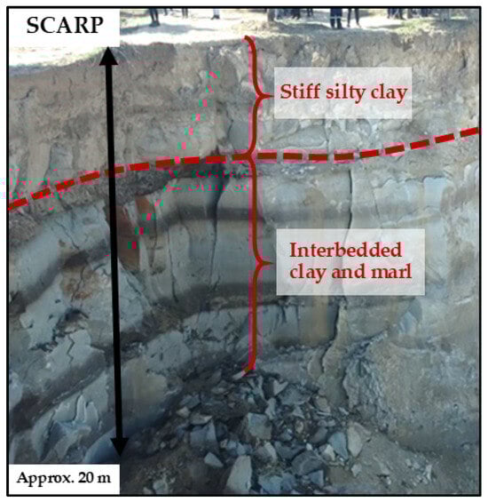 One important parameter for analysis is the location of the slip surface observed in the site, which has been identified as a deep, weak, thin layer within the interbedded strata [6]. According to the studies performed in the area, the sliding surface is estimated to occur at a depth of 20 to 30 m parallel to the ground surface [2,3]. Therefore, the location of the sliding surface has been estimated to be at 25 m, where it is assumed to coincide with the contact between the interbedded clay and marl, and the hard clay to weak claystone layers.