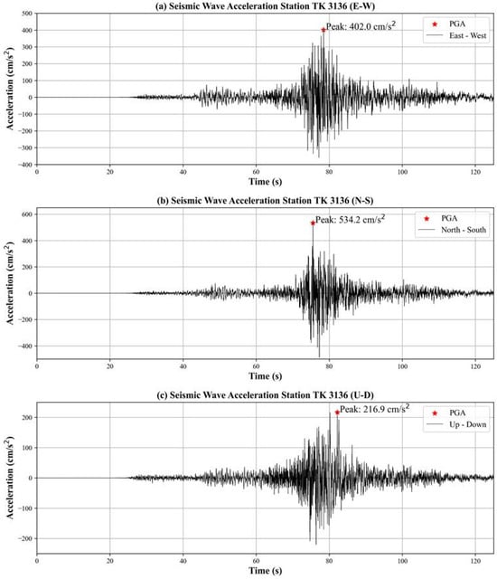 Recorded Peak Ground Accelerations (PGA) at TK 3136 AFAD Station: (a) East–West component, (b) North–South component, (c) Up–Down component.