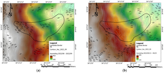Once these files were defined, the geomorphometric analysis was employed, following the methodology for extracting parameters and objects from each grid within the DEM dataset, as outlined by [32]. In this study, the DEMs are the primary inputs for constructing a surface model based on the elevation data embedded within each DEM. The geomorphometric analysis was conducted using ArcGIS 10.8.2 software and its Spatial Analyst tools. This process generated polylines representing contour levels with a 1 m detail, encompassing an approximate total area of 0.55 m2 surrounding the landslide. An example of the resulting contours obtained from the DEM input is depicted in Figure 4a,b. These figures exemplify the processed results for the Ascending pre-earthquake DEM contours and the Ascending post-earthquake DEM contours, respectively.
