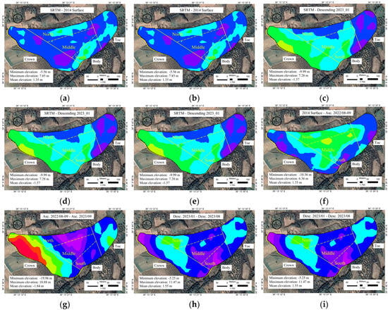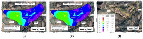 The comparisons of the surfaces, which highlight the elevation change across various ranges, along with the minimum, maximum, and mean elevations for each comparison, are shown in Figure 5a–l. To further streamline the analysis, the areas affected by the landslide are considered as illustrated in Figure 5l. In this figure, the crown, toe, and body of the landslide are delineated, and the corresponding maximum and minimum changes for each combination within these areas are identified.