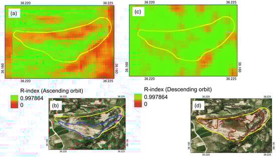 R-index models for the ascending and descending Sentinel-1 SAR orbits (a,c). (b,d) are corresponding optical images; the landslide area is annotated by yellow polygons; high R-index values are annotated by blue and red polygons, respectively.