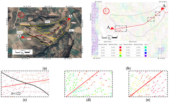 (a) Aerial view and alignment definition. (b) Slope arrow map. (c–e) Close up of the alignment definition aligned to the slope direction.