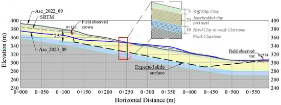 Figure 8 also shows the estimated sliding surface, which has been defined to be at a depth of 25 m, rather than 20 m, to account for DEM variation and the previously analyzed descriptions of the site after the event. These records also help to delineate the crown and toe of the landslide, as it did not extend back to the top of the slope as the profile difference depicted.