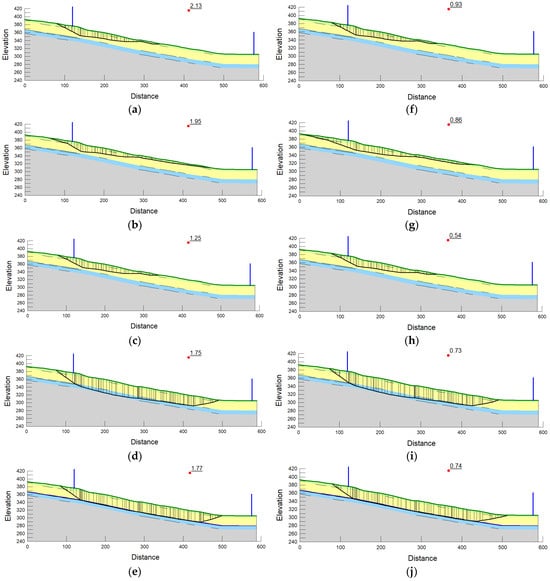 Static stability analysis resulting in FoS and sliding surface: (a) Scenario 1, (b) Scenario 2, (c) Scenario 3, (d) Scenario 4, and (e) Scenario 5. Pseudo-static stability analysis of the FoS: (f) Scenario 1, (g) Scenario 2, (h) Scenario 3, (i) Scenario 4, and (j) Scenario 5.