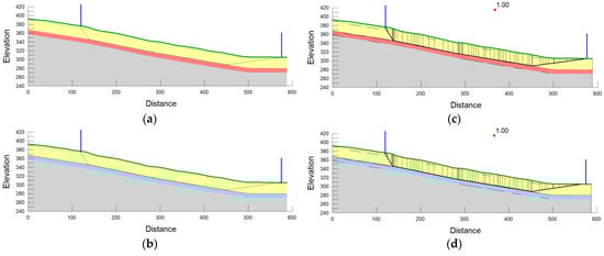 The estimated slip surface and its location within the defined stratigraphy used in the analysis for Scenarios 4 and 5 are shown in Figure 10a,b, respectively. Additionally, the slip surface with the corresponding FoS value of 1.0 is given in Figure 10c,d once the residual strength has been adjusted. The final parameters defined for each layer are summarized in Table 8, where the hard clay to weak claystone is back-calculated to a friction angle of 21°.