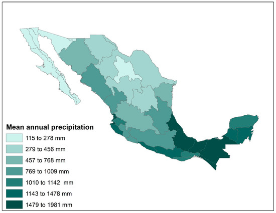 The hydrological regions group the basins according to their morphological, orographic, and hydrological characteristics and are generally defined by the country’s main hydrographic basins. The Mexican hydrological basins drain into either the Pacific Ocean or the Gulf of Mexico, except for a group of northern endorheic basins located in HR34, 35, 36, and 37. Natural availability of water (i.e., precipitation minus potential evapotranspiration, PET) varies by season and the location of the HR. For example, most precipitation occurs during summer, except in the northern Baja California Peninsula, where maximum precipitation occurs in winter [29]. Regarding location, the basins in northern and central Mexico have low natural water availability due to low precipitation; however, economic activities and population are concentrated in these regions [30]. According to CONAGUA, renewable water availability in the southeast is already seven times greater than in the rest of Mexico, with values of 10,718 and 1581 m3 per inhabitant per year, respectively [26].