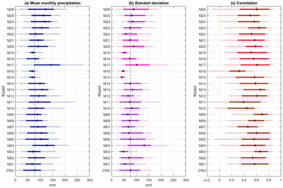 Mean monthly precipitation (a), standard deviation (b), and Pearson correlation coefficient between CRU data and the climate models (c) for the historical period (1985–2014). Each boxplot was computed using results from the hydrological regions. The dashed line indicates the CRU median value.