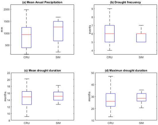 Mean annual precipitation and drought indicators in the historical period (1985–2014) for CRU data and the median of the climate models data (SIM). Each boxplot was computed using the results from the hydrological regions.