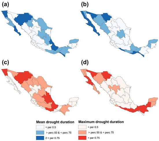 Percentiles of mean drought duration for CRU data (a) and the median of climate model data (SIM data) (b), and maximum drought duration for CRU data (c) and SIM data (d) for the historical period (1985–2014).