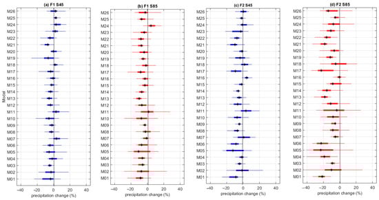 Figure 6 shows the change in precipitation between the historical period and the future periods (F1 and F2). This figure highlights the variability among climate models when a given scenario is considered. For instance, in the near future (F1) under the S45 scenario, the projected median change values range from 3.5% (M07) to −7.1% (M21); however, most models (19) project negative median changes (Figure 6a). Considering the same period but under the S85 scenario (Figure 6b), the projected median change in precipitation ranges from 4.3% (M24) to −10.8% (M13), with 24 climate models estimating negative changes. In the far future (F2), the models under the S45 scenario project changes between 4.4% (M16) and −12.4% (M05), with 21 climate models projecting negative changes (Figure 6c). The most significant changes are projected in the far future (F2) under the S85 scenario (Figure 6d), with values ranging from −0.5% (M16) to −23.1% (M05). The climate models show great variability, revealing differences among the hydrological regions. For example, in the F2 S85 scenario, model M02 has a wide range of projections, from 27% (HR04) to −42% (HR21), while model M03 shows a smaller range, from −0.3% (HR17) to −16.7% (HR03). However, both models present similar median values of change (about −9.5%).