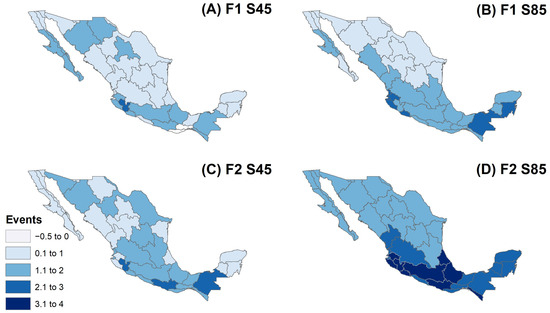 Figure 8 shows the change in the drought frequency indicator between the reference and the future periods. For the near future (F1), the scenario S45 (Figure 8A) shows small changes in this indicator, with values of one to two events in the Baja California Peninsula, the central hydrological regions, and the northwest hydrological regions. On the other hand, the scenario S85 (Figure 8B) shows a clearer difference between the north and the south, with more significant changes in the latter, especially in the southeast, with values of two to three more events in the Grijalva-Usumacinta (HR30) and in the south of the Yucatan Peninsula. Regarding the far future (F2), the scenario S45 (Figure 8C) shows a mixed geographical distribution in the change of this indicator. On the contrary, the scenario S85 (Figure 8D) shows that northern and central Mexico project an increase of one to two events, while the southeast, the Yucatan Peninsula, and central Pacific hydrological regions (HR11 and HR13) show an increase of two to three events. The most important change is projected in the central Mexico hydrological regions, from the Pacific Ocean to the Gulf of Mexico, with an increase of three to four events.