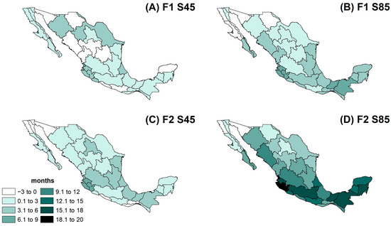 The change in the mean drought duration indicator is shown in Figure 9. The near future F1 S45 projects low changes and even a decrease in this indicator (Figure 9A) except for the Bravo-Conchos hydrological region (HR24) and some hydrological regions in the Central Pacific (HR13 to HR16), where values range from 3 to 6 months. The F1 S85 scenario (Figure 9B) presents a greater increase in this indicator: the northern HRs have values of 3 to 6 months; the Gulf of Mexico HRs present values of 6 to 9 months; and the central Pacific and the southeast regions have values of 9 to 12 months. The F2 S45 scenario (Figure 9C) shows a similar pattern to F1 S85, and the most important changes are projected with the F2 S85 scenario (Figure 9D), which presents mixed results ranging from no change to 6 months in the northern HRs, 9 to 12 months in most of the southern HRs, and 15 to 18 months in the southeast HRs. The most significant change is projected again in the central Pacific HRs, with an increase of 18–20 months.