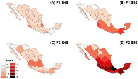 Figure 10 shows the number of drought events in future periods that are more severe than the most severe event that occurred in the reference period. The F1 S45 scenario (Figure 10A) presents a value of one event in most of the territory, while F1 S85 (Figure 10B) shows a value of two events in the central and southern hydrological regions. The F2 S85 scenario (Figure 10C) also projects values of 1 to 1.5 events in most of HRs except for the northwest, which presents no event, and a value of about 2 events in the central HRs from the Pacific Ocean to the Gulf of Mexico. Finally, the F2 S85 scenario (Figure 10D) shows a marked geographical difference, as the northern HRs range from 1 to 2.5 events and the southern regions from 3 to 4 events, with a value of 4.5 events in HR 28.