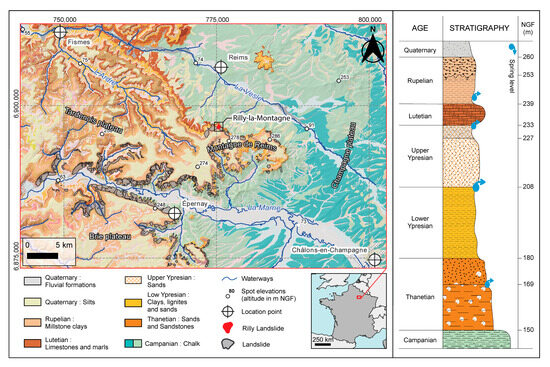 The Champagne vineyards region is characterized by a succession of clay–marl layers. The base of the slope is cut in Campanian chalk (Upper Cretaceous), which crops out up to 30 m above the bottom of the valley floor. The chalk is overlain by various layers of aclinal cenozoïc rocks: Thanetian sands, Lower Ypresian clays and marls, Upper Ypresian sands, Lutetian limestones and marls, and Bartonian and Priabonian clays [22]. The top of the plateau is covered with siliceous limestone and clay derived from Oligocene silicification and post-exhumation Quaternary argillization (Figure 1). The superimposition of all these geological layers results in numerous landslides.
