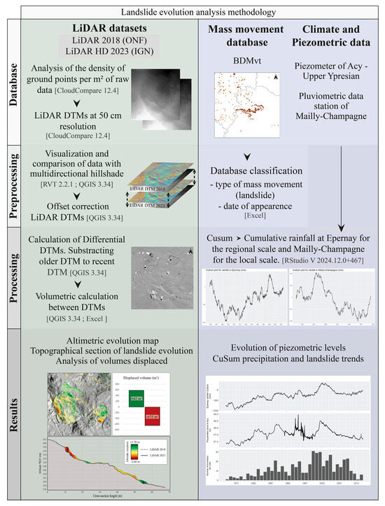 To quantify the evolution of the Rilly landslide, two LiDAR databases were used and then correlated with the climatic and piezometric data (Figure 4). LiDAR is a good tool for detecting landslide patterns [25,26]. The first LiDAR image was captured in 2018 by ONF (Office Nationale des Forêts). The second LiDAR image was captured in 2023 by IGN (Institut Nationale de l’Information Géographique et Forestière). The acquisition flights were conducted in winter, which is when the deciduous canopy is sparse, thus allowing for higher-quality data capture. These conditions are optimal for the quality of the data obtained. This is demonstrated by the density of points per m2. Indeed, the percentages of NoData per m2 of our two LiDAR images are extremely low, i.e., below 2% (Table 2). Overall, the 2018 ONF LiDAR image has a number of points per m2 greater than 10. The 2023 IGN LiDAR image contains over 15 points per m2. The quality of our two clouds was, therefore, very satisfactory. The density of points per m2 of the LiDAR 2018 ONF image was good enough to produce a DTM with a resolution of 50 cm, while, for the LiDAR 2023 IGN image, a DTM with a resolution of 25 cm was conceivable. However, in order to limit the bias as much as possible and to optimally compare the two LiDAR DTMs, the chosen resolution was 50 cm. The altimetric and planimetric accuracy of our LiDAR data was correct, with an altimetric accuracy of ±10 cm for our two LiDAR images, a planimetric accuracy of ±25 cm for the 2018 ONF LiDAR image, and ±50 cm for the 2023 IGN LiDAR image.