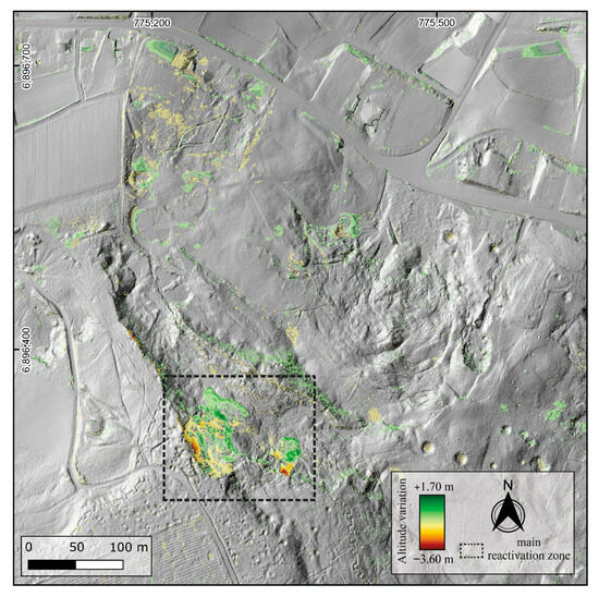 The reverse slope is marked by lower, but homogeneous, displacements (Figure 7). The upper part of the landslide, close to the main scarp, shows elevation losses across the entire width of the Rilly landslide. Conversely, the part exposed to the northeast shows an increase in elevation. This systematic distribution of the elevation changes reflects a global displacement of the Rilly landslide. Under the stress of the overall displacement, this uncoupled block [24] tilts slightly down the slope. This is caused by the upper part of the landslide, where the main reactivations take place. Other changes appeared between the two LiDAR images. These were generally sporadic and less significant displacements, as shown in the flow. These movements can show that the landslide is still active. In shell holes or ponds [38,39,40], the water level, inherent to the filling of the shape, constitutes an artifact for our results. Similarly, changes along the roads or other linear structures result from anthropogenic modifications (roadside maintenance, hedge trimming, etc.) and should not be considered in the analysis of landslide evolution.