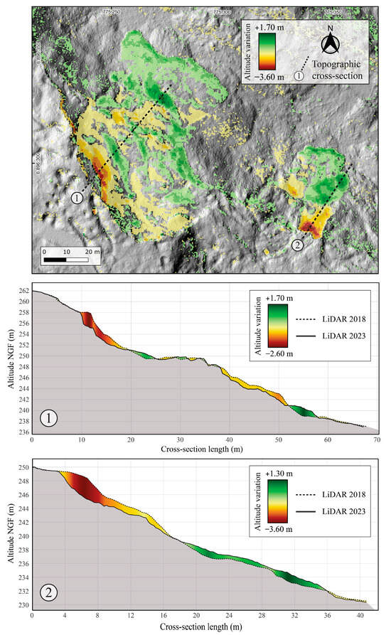 A comparison of the LiDAR images from 2018 and 2023 provides information on the displacements during this period. Once again, the most significant changes were observed in the upper part of the main scarp (Figure 7). This sector is marked by two major reactivations, with elevation changes exceeding 3 m in the erosion or departure zones and approaching 2 m in the accumulation zones.