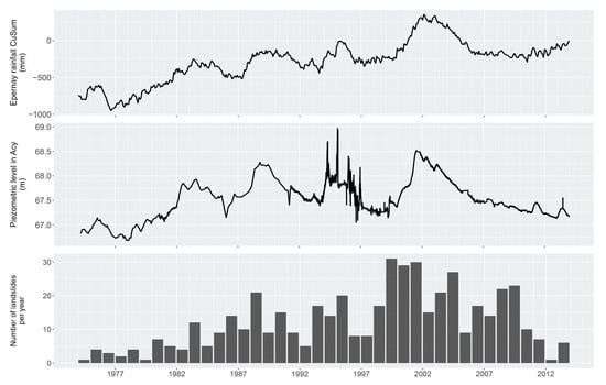 On a global scale, the importance of water resources on landslide triggering and activity has already been demonstrated in the region [12]. The example of Rilly tends to confirm this trend. Cross-observation of several indicators shows a significant correlation: standardized piezometric levels in the Upper Ypresian sands at Acy, the deviation of the cumulative sum from the mean (CuSum) of monthly precipitation at Epernay (a station representative of the region; Météo France data), and the number of landslides in the region (BRGM database) (Figure 10). The data stop in 2013 as the landslide database has not been updated since that date.