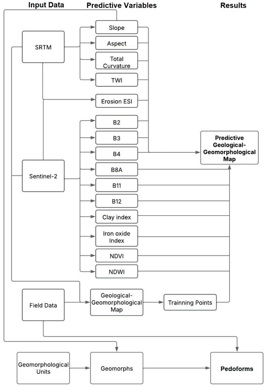 By correlating geological and geomorphological characteristics with present-day landscape features, this study aims to enhance the understanding of landscape evolution in the Natividade region. Using Sentinel-2 and SRTM (Shuttle Radar Topography Mission) imagery combined with machine learning techniques, particularly the Random Forest algorithm, it proposes a methodological framework for mapping geomorphological patterns and terrain dynamics. The approach is based on two geospatial products: (i) a pedo-geomorphological map, which derives information on soil distribution from geomorphic units and slope variations, and (ii) a predictive geological–geomorphological map, incorporating multiple remote sensing indices.