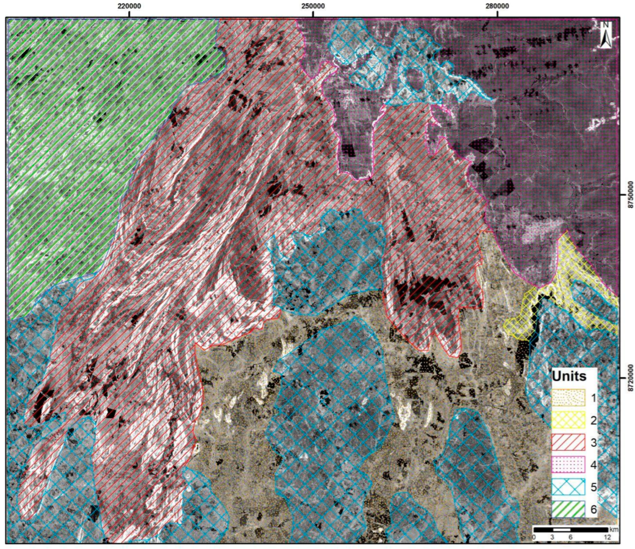 PGG Unit 3—This unit corresponds to the Almas Terrane and is associated with pasture areas and spectral patterns indicative of anthropogenic activities.